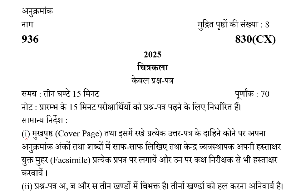 Class 10 Drawing Paper 2025-830-CX : UP Board Previous Year Paper Board Exam 2025 के चित्रकला (Arts) के सभी पेपर की पीडीऍफ़