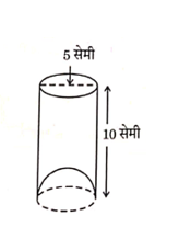 - एक जूस बेचने वाला अपने ग्राहकों को दी गई आकृति में दर्शाए गए गिलासों से जूस देता था । बेलनाकार गिलास का आन्तरिक व्यास 5 सेमी था, परन्तु गिलास के निचले आधार (तली) में एक उभरा हुआ अर्धगोला था जिससे गिलासों की धारिता कम हो जाती थी । यदि गिलास की ऊँचाई 10 सेमी थी, तो गिलास की आभासी धारिता एवं वास्तविक धारिता ज्ञात कीजिए। (=3-14 लीजिए) 6