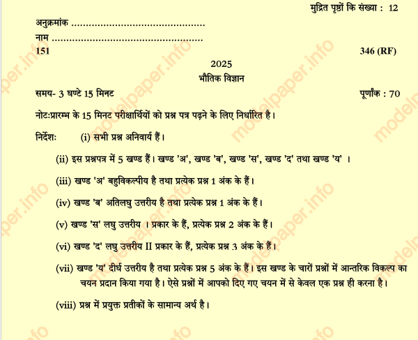 भौतिक विज्ञान कक्षा 12 प्रश्न पत्र 2025 वार्षिक परीक्षा की पीडीऍफ़ Model Paper, New Model Paper Question PDF Free